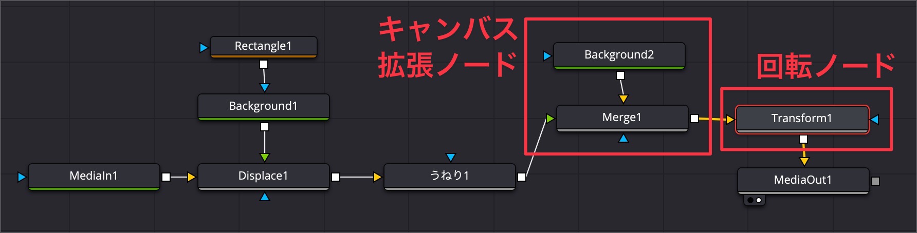 - 合成 の出力を 変形 へ繋ぎ、最後に MediaOut へ。