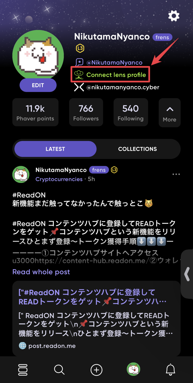 Phaverのアカウント画面のLens表記が「Lens Profile」のハンドル名になっているのが確認できたら完了です!