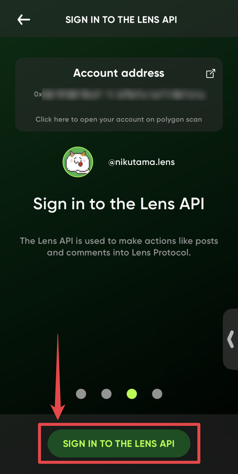 「SIGN IN TO THE LENS API(レンズ API にサインインする)」画面になるので「SIGN IN TO THE LENS API」ボタンをタップします。