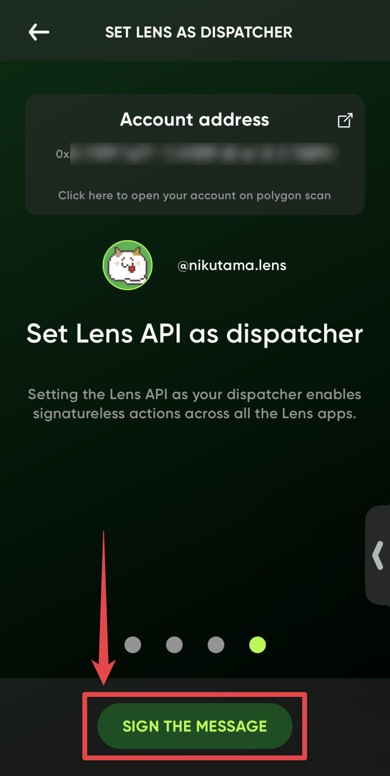 「SET LENS AS DISPATCHER(レンズをディスパッチャーとして設定)」画面になるので「SIGN THE MESSAGE(署名する)」ボタンをタップします。