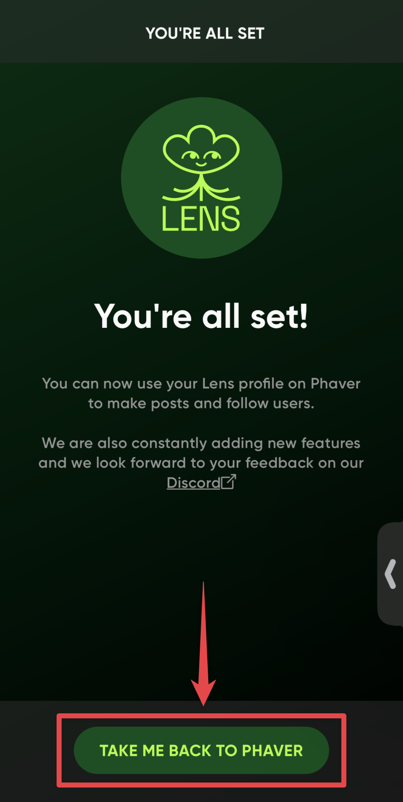 「You’re all set!(準備完了!)」と表示されていたらOKです!「TAKE ME BACK TO PHAVER(フェーバーに戻る)」ボタンをタップします。