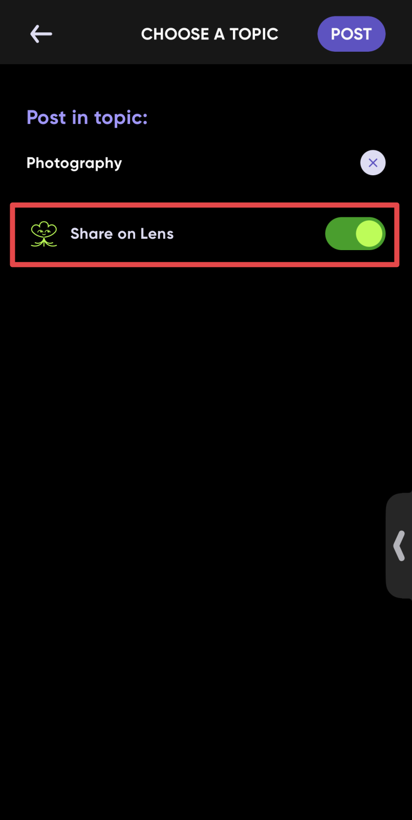 今後はポスト時の「CHOOSE A TOPIC(トピック選択)」画面「Share on Lens(レンズで共有)」のトグルスイッチが表示されデフォルトでオンになっているので、Phaverで投稿するとLens Protocolにも共有されるようになります。